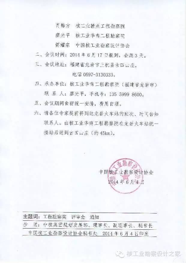 兹定于2014年6月18日到20日召开2014年度核工业部级优秀工程勘察奖评审会,通知文件如下: