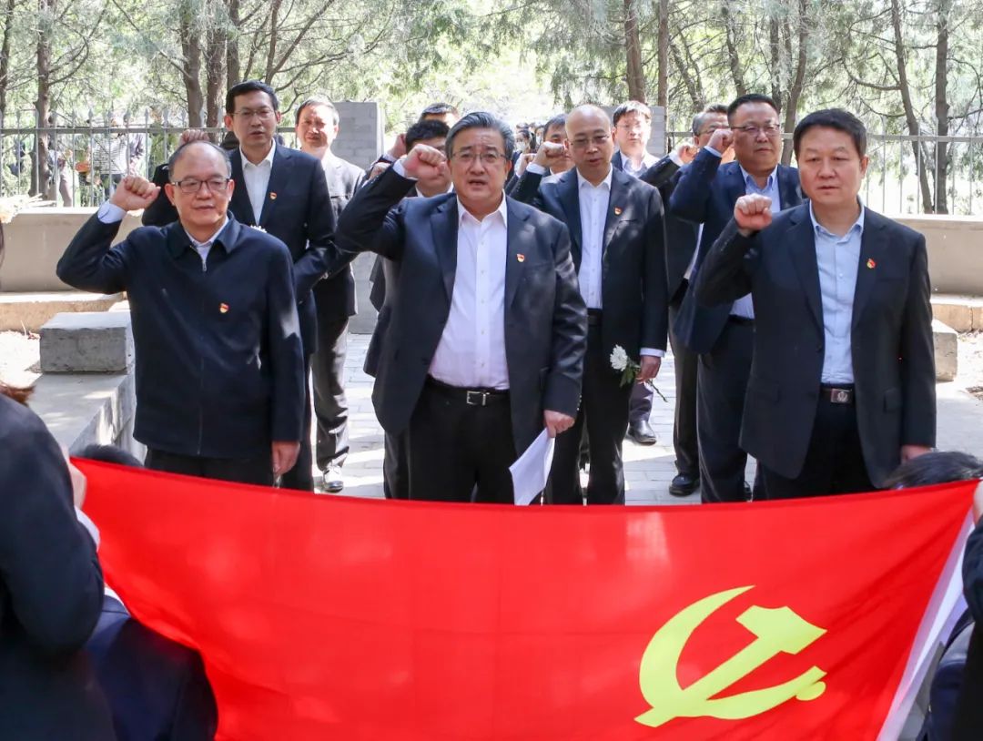 中核集团在纪念碑前敬献花篮,余剑锋缓步走向前,仔细整理挽联,全体人员肃立,神情凝重,向先烈致敬,默哀一分钟。接着余剑锋带领在场全体党员,面向党旗,举起右拳,庄严重温入党誓词,铿锵有力的宣誓声响彻陵园。