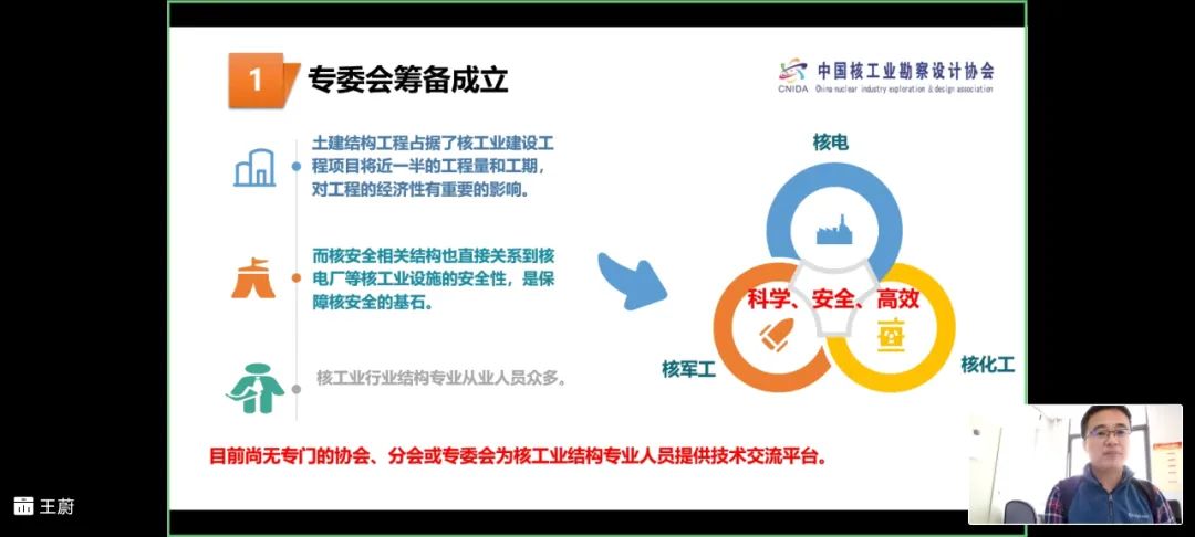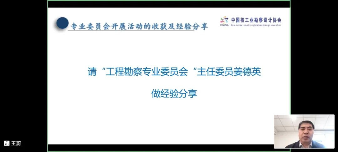 王蔚首先对各专业委员会负责人为促进协会发展、增强协会凝聚力、推动行业技术进步、构建优质交流平台等方面所做出的辛苦努力表示诚挚的谢意!随后从协会2020年总体工作情况汇报、专业委员会2020年总体工作情况汇报及专业委员会2021年度工作设想等三个方面做了《2020年度中国核工业勘察设计协会工作报告》。2020年对于国家是大考之年、大战之年,对于协会也是非同寻常的一年。协会以习近平新时代中国特色社会主义思想为指导,增强“四个意识”、坚定“四个自信”、做到“两个维护”,始终秉承“以促进行业发展为己任,以服务会员单位”为宗旨,坚持党建工作引领协会工作、协会工作促进党建工作的理念,把握稳中求进工作总基调,迎难而上,开拓进取。在党建工作、“核”力抗疫、复工复产、精准扶贫、基础建设及特色活动等方面圆满完成了年度工作目标。特别是成功举办第八届会员大会,产生新一届理事会、监事会、常务理事会和协会负责人,为协会长期稳定发展打下了良好的基础,奠定了强有力的组织保障。王蔚强调指出,专业委员会是协会工作的重要组成部分,是支撑协会稳步发展的重要着力点,是协会更好的服务于广大会员单位的重要体现,是广泛开展技术交流的优质平台。2020年度在各专业委员会负责人的带领下,专业委员会的活动结合本专业领域的特点,既有技术交流与研讨、优秀论文分享等传统形式,也有现场考察、主题文化作品比赛、核电设备展览、最具潜力解决方案推广等等新颖形式。各专业委员会负责人开拓思路,通过丰富多彩的形式扩大了协会的影响力,增强了协会的吸引力,极大地促进了协会的发展和建设。特别是2020年9月在浙江海盐举办的第四届核电设备及技术展览会(NME2020)暨海盐·核电高峰论坛,是专业委员会最具亮点的一个品牌大会。论坛吸引了来自全国各地的行业大咖,涵盖政府机构、运营公司、工程公司、设计院、设备厂家、技术服务商等300余家单位的730余位嘉宾莅临出席,大家碰撞观念,交流技术,传递信息,共析核行业设备制造与技术服务的机遇与挑战,充分彰显协会品牌效应和影响力。在“专业委员会开展活动的收获及经验分享”主题讨论中,工程勘察专业委员会主任委员姜德英、工程设计专业委员会主任委员武中地、工程监理专业委员会秘书长韩春林、核设备专业委员会李经怀、核工业结构专业委员会秘书长姚迪、进口核设备专业委员会副秘书长杨静远、核工业质量管理工作委员会副主任委员李树亭、核工业电气专业委员会主任委员窦慧元,核设施厂址安全专业委员会主任委员潘蓉等各专委会负责人先后做了发言,回顾2020年度本专业委员会的工作收获,畅谈2021年度专业委员会工作开展的设想。大家一致表示,协会构建专业委员会的平台是会员单位沟通交流的桥梁和纽带,是密切会员单位协同发展的载体,是广大会员单位非常珍贵的优质平台。作为专业委员会负责人要认真履行责任,吸取兄弟专业委员会的经验,带领本专业委员会完成2021年度工作计划。同时与会代表就第五届核电设备及技术展览会(NME2021)暨海盐·核电高峰论坛的总体方案进行了讨论,并为协会组织开展专业委员会工作建言献策。会议最后协会对“会员管理系统专业委员会管理模块”进行了简要的介绍,希望各专业委员会和广大会员单位支持协会信息化建设,不断提升协会的基础管理水平,共同推动协会各项工作的全面提升。