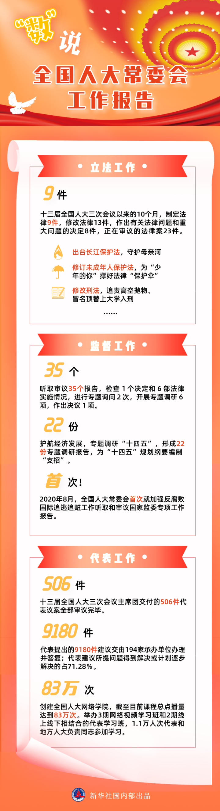 立法工作——胸怀“国之大者”、满载人民期盼 始终胸怀“两个大局”,牢牢把握“国之大者”,是2020年全国人大常委会立法工作的鲜明印记。 报告显示,十三届全国人大三次会议以来的10个月,全国人大常委会制定法律9件,修改法律13件,作出有关法律问题和重大问题的决定8件,正在审议的法律案23件。 抗击新冠肺炎疫情,一年来,以法治思维、法治方式从容应对风险挑战的制度力量充分显现。 抗疫关键时刻,及时作出关于全面禁止野生动物非法交易和食用的决定,接着就这一决定和野生动物保护法开展执法检查,随后启动野生动物保护法的修改;战“疫”胶着期,强化公共卫生法治保障,及时制定专项立法修法工作计划,成立专班分批推进多部法律的制定和修改工作。 捍卫宪法法律尊严,一年来,推动宪法实施、加强宪法监督,维护国家法治统一的成效更加显著。 从修改国旗法、国徽法,更好维护国家形象、弘扬爱国主义精神,到修改选举法,适当增加县乡两级人大代表名额,夯实人民代表大会制度基础,宪法相关法律制度不断完善,宪法权威得到有力维护。 全国人大常委会工作报告指出,适应国际形势深刻复杂变化、党和国家事业快速发展的需要,立法工作进入加快发展的新阶段,呈现覆盖广、数量多、节奏快、要求高的新特点。 制定生物安全法、出口管制法,修改档案法,审议数据安全法草案、个人信息保护法草案……涵盖经济安全、资源安全、生态安全等领域,国家安全立法迈出坚实步伐。 审议乡村振兴促进法草案、海南自由贸易港法草案,作出关于设立海南自由贸易港知识产权法院的决定和关于设立北京金融法院的决定……高质量立法为高质量发展、高水平对外开放提供坚实法制保障。 审议通过香港特别行政区维护国家安全法,有利于确保“一国两制”行稳致远;长江保护法高票通过,守护一江清水绵延后世、惠泽人民;刑法修改对冒名顶替上学就业、抢夺公交车方向盘、高空抛物等新情况新问题作出直接回应;反食品浪费法草案从“小切口”入手,以法治引领节俭新风尚…… “2020年,一批解民忧、纾民困、惠民生的民生领域法律密集制定修改,制度设计科学管用,具体条文务实可行,充分展现了以法治方式维护人民权益、回应人民期待的价值导向。”江西省医疗保障局局长梅亦代表说。 监督工作——护航改革发展、增进民生福祉 2020年8月10日,全国人大常委会首次听取审议国家监察委员会关于开展反腐败国际追逃追赃工作情况的报告,标志着人大对“一府一委两院”监督工作迈出新步伐。 “这既是维护宪法权威、实施国家监察制度的重要体现,也是人大依法履行监督职能,不断丰富和完善人民代表大会制度的重要探索。”上海市人大常委会副主任陈靖代表说。 寓支持于监督之中,监督工作始终在大局中站位,在大局中谋划。 如何既巩固脱贫攻坚成果,又助力全面实施乡村振兴战略?全国人大常委会听取和审议国务院关于脱贫攻坚的专项工作报告,及时开展农业机械化促进法执法检查,让全面建成小康社会的成色更足、质量更高。 力求监督实效,监督触角不断向民生领域延伸。 围绕野生动物保护、土壤污染防治、慈善事业健康发展、公共文化服务保障等问题,全国人大常委会通过监督工作促进民生社会事业发展,增进人民福祉。 管好“国家账本”,看好政府“钱袋子”,是人大监督的一项重点工作。 全国人大常委会围绕预算决算、审计和国有资产管理开展监督,开展全口径预算审查、全过程预算监管,作出关于加强国有资产管理情况监督的决定,让公共财政置于阳光之下。 在加强执法司法监督方面,2020年,全国人大常委会将监督的目光投向公安机关执法规范化建设、民事审判工作、认罪认罚从宽制度等党中央决策部署、民众高度关注、关乎社会和谐稳定的重点领域,通过强有力的人大监督,推动改进相关工作,让公平公正更加可触可感。 2020年,河北省唐山市居民蔡女士给全国人大常委会法工委写了一封信,就某省邮政条例提起审查建议。法工委审查认为,对不能确定安全的物品一律要求用户出具相关部门的安全证明,不符合当前减少证明事项的改革要求,要求制定机关作出修改。 全国人大常委会工作报告显示,2020年全国人大常委会共收到报送备案的规范性文件1310件,逐件进行主动审查;围绕疫情防控、民法典实施等五个方面开展专项审查和集中清理,发现需要修改或废止的规范性文件3372件……扎实有效的备案审查工作,为维护宪法法律权威和尊严,促进国家法治统一发挥了重要作用。 代表工作——保障依法履职、焕发制度活力 506件代表议案、9180件建议,全部办理完毕并答复;常委会组成人员直接联系439位代表;邀请175人次代表列席常委会会议…… 面对突如其来的新冠肺炎疫情,十三届全国人大常委会迎难而上,推动新时代代表工作提升到新的水平。 2020年,全国人大网络学院上线,代表学习培训实现“跨越式”发展。报告显示,全国人大网络学院为代表和各级人大提供了学习培训的新途径,截至目前课程总点播量达到83万次。 “网络学院里既有涉及人大制度本身的专业知识,又涵盖生态文明建设、民法典等多个领域,能够满足大家的个性化学习需求。”重庆璞雨为科技创新中心有限公司执行董事高钰代表说,目前已经学习了29门课程,将努力把学